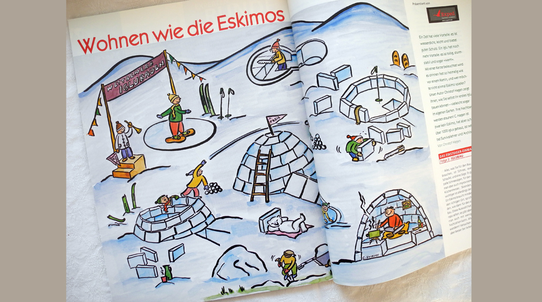 Illustrationen für eine Serie im Magazin Outdoor, die den Outdoor-Fans zeichnerisch Tipps gegeben hat. In jeder Ausgabe habe ich ein spezielles Thema illustriert wie Biken, Zelten, Packen, Kanufahren oder das Bauen eines Iglus. Die Zeichnungen wurde doppelseitig veröffentlicht.