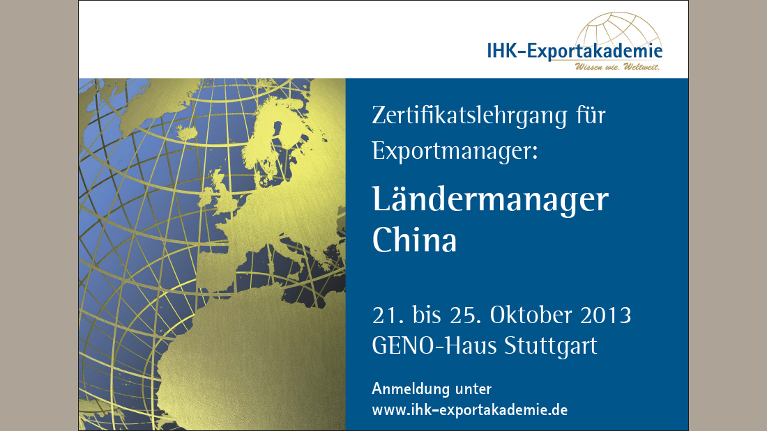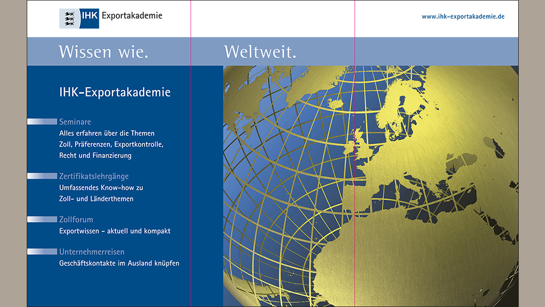 Die IHK-Exportakademie wurde 2010 von den baden-württembergischen IHKs gegründet und bietet Seminare für Fach- und Führungskräfte sowie Zertifikatslehrgänge an und ermöglicht es Unternehmen, zu Spezialthemen im Auslandsgeschäft stets am Puls der Zeit zu sein. Ich war von Anfang an mit der Gestaltung des Corporate Designs der Exportakademie beaufragt. Angefangen von der Logogestaltung über die Gestaltung der Seminarmappe, Plakate und Veranstaltungsflyer bis hin zu Präsentationsmedien wie Display und Messewand konnte ich das Design für die IHK-Exportakademie stetig weiter entwickeln.